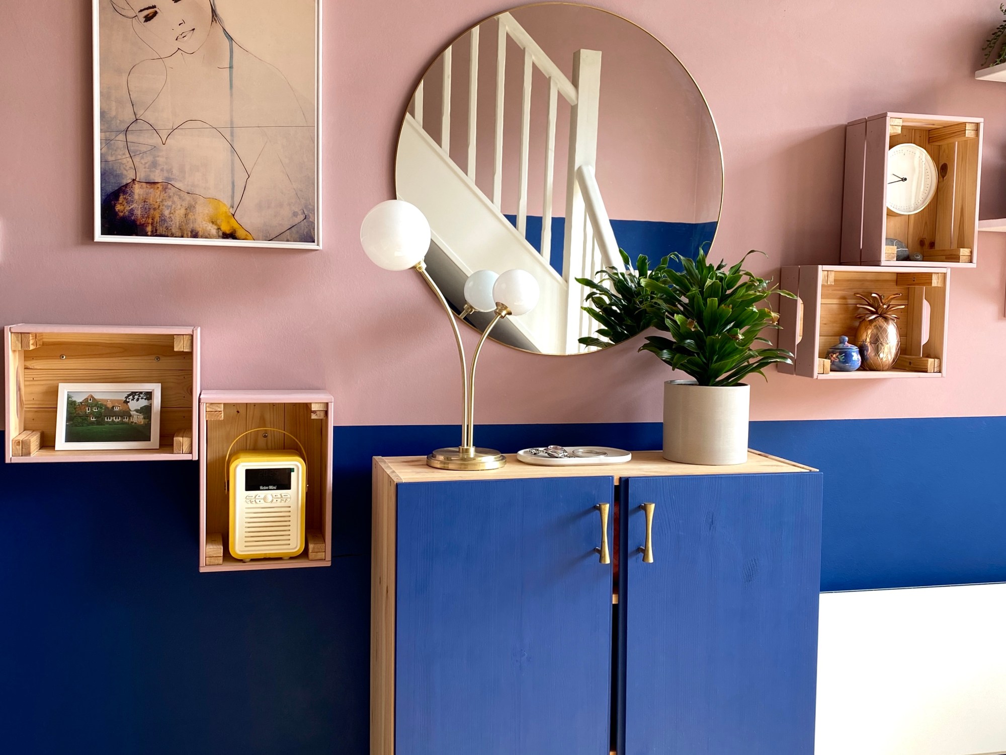 Top tip: If your handles are a little wonky even after careful measuring, it may be due to the hang of the doors. You can adjust this by loosening the tightness of the hinges. - Paint the doors. I just used a standard wall emulsion for this, the same as I used on the wall behind. I did not use a primer and I didn’t treat it afterwards, and so far it has remained in perfect condition. However, if it were in a more high-traffic area of the house I would have painted a topcoat on for some extra durability.
